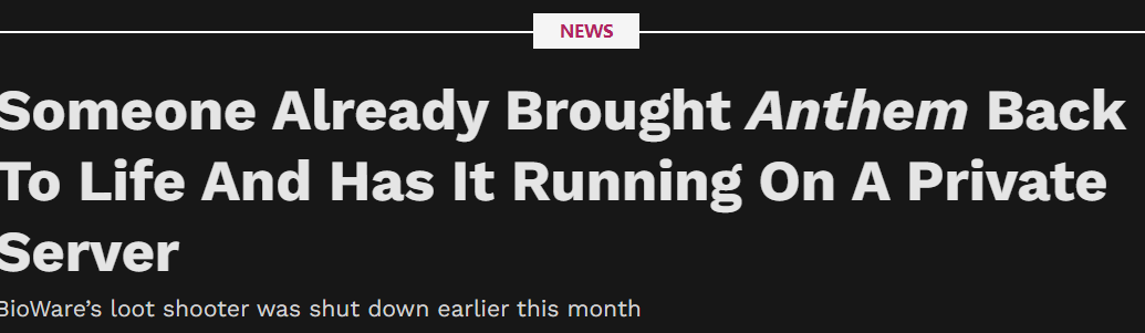发售前备受期待的“3A”大作《圣歌》历经正式发售后的一路低潮,终于在1月13日彻底关服,不过根据外媒的报道,已经有高玩在测试私人服务器了,架设者则表示在努力让仍然喜欢这款游戏的玩家能够再次游玩。