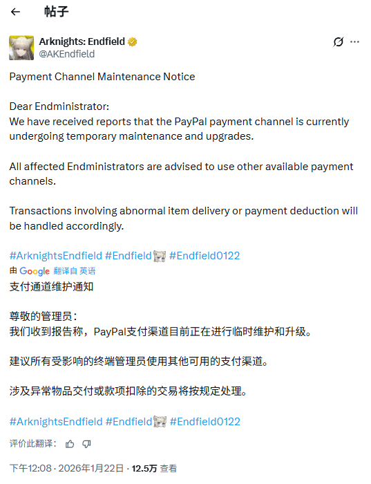开发商鹰角网络随后在X(原Twitter)上作出回应,确认已注意到相关情况,并已将PayPal支付方式暂时下线进行技术维护。官方建议玩家在此期间改用其他支付渠道进行游戏内消费。关于受影响玩家的退款与赔偿问题,目前尚未公布具体处理方案。