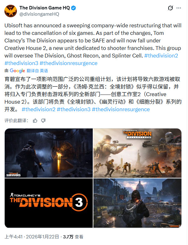 育碧将下设5个“创意工作室”,分别负责不同的IP,每个工作室都有自己的领导层,并对各自的IP组合承担“端到端”的责任,以便更快、更好地做出决策。