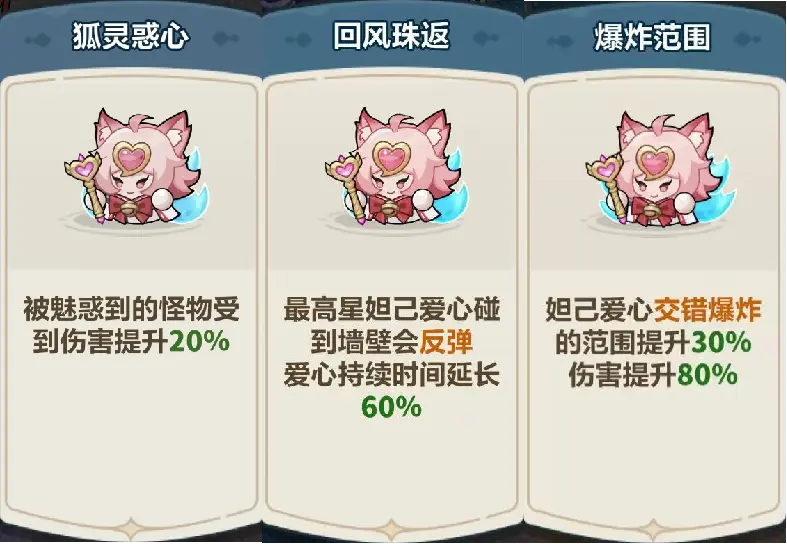 Lv.5:解锁【千狐魅影】大招;(质变开始,输出与控制范围大幅提升)Lv.10:初始即获得【灵魂震爆】选项-爱心交错时爆炸,造成240%伤害并魅惑怪物;