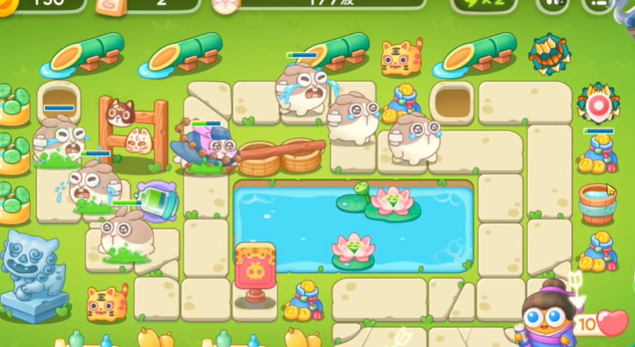 3、将池塘中间的荷花清理掉之后继续摆放更多的弓箭。