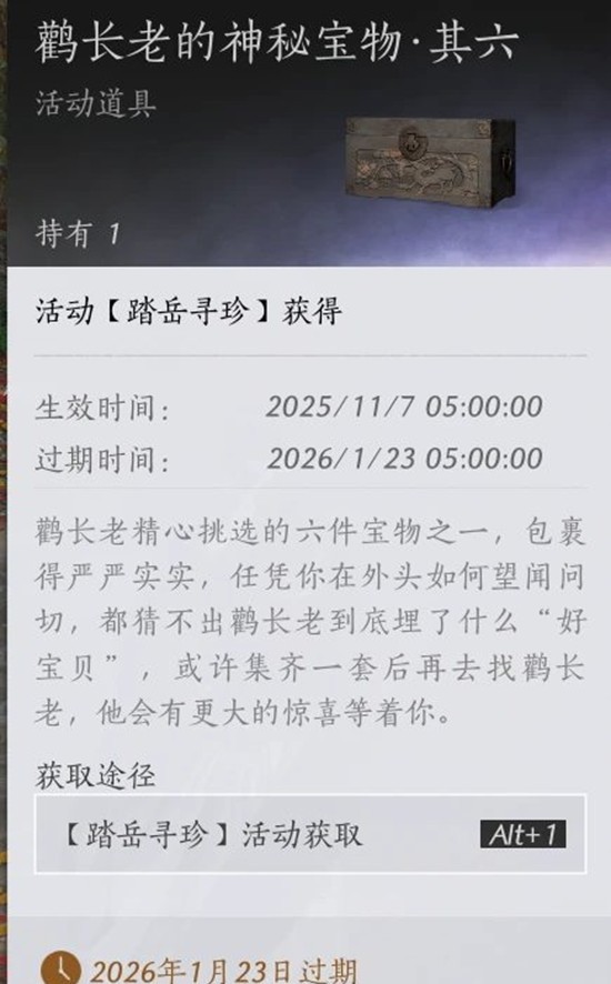 Step2 包里有18个鹤长老的神秘宝物后(不拘泥于其一其二这种具体哪个,够数就行)一可以去天工地库里用缩骨功卡一个很难找到的位置,然后放置箱子;二可以试着卡地图上天或者入地(仅移动端);三可以直接找个本来就不好到达的位置原地开始搭梯子升天把宝藏藏在半空中
