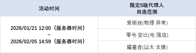 在本期频段中,可自选的限定S级代理人包含:[爱丽丝(物理·异常)]、[零号·安比(电·强攻)]、[耀嘉音(以太·支援)]