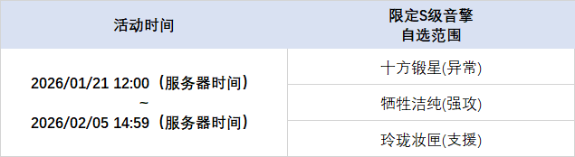 在本期频段中,可自选的限定S级音擎包含:[十方锻星(异常)]、[牺牲洁纯(强攻)]、[玲珑妆匣(支援)];绳匠可随时在调频页面切换页签更换UP的音擎。