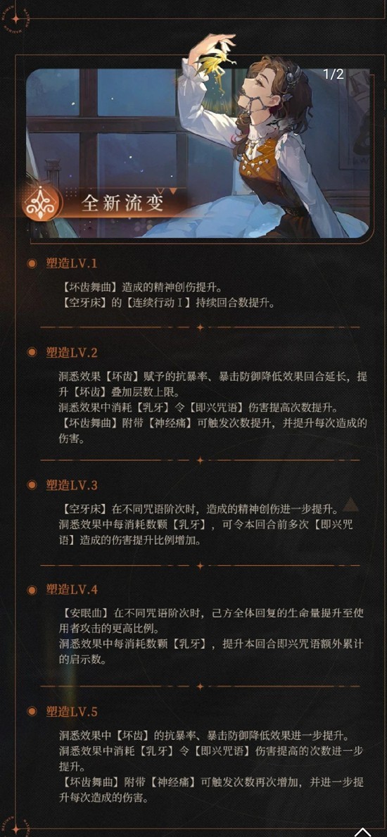 总结一下,牙仙这次获得的狂想与流变效果非常强,牙仙在木启示中完全称的上是核心,机制很契合木启示(所提供加伤效果与(神经痛)有一定次数限制),同时其所能提供的增益减益,连续行动以及快速累积启示点数效果,甚至能够让她进入星启示队时也会有一定强度。不过为了能获得仪式,牙仙需要在队伍里占据一定牌权。流变推荐1,2塑,1塑最优,没有塑造也非常强力,不需要强追塑造。