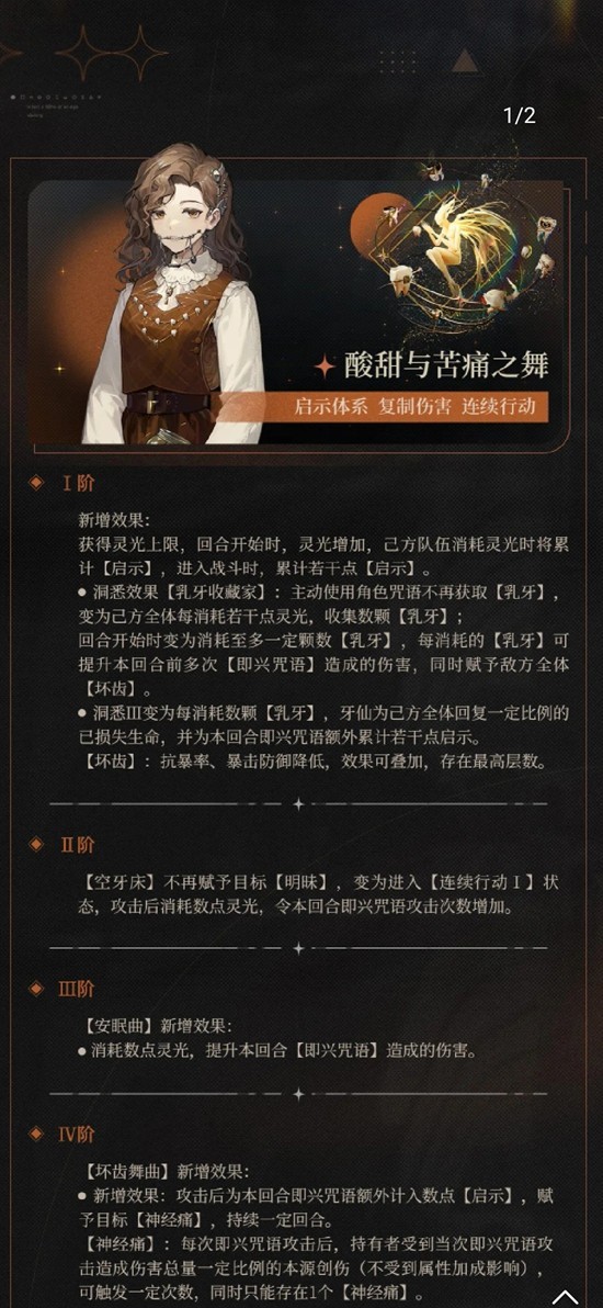 洞悉:牙仙的洞悉效果总体来说变化最大,其乳牙变为消耗灵光获取,同时每回合开始能至多消耗一定数量乳牙为敌方赋予减益(坏齿),为我方赋予增益。减益效果使得敌方的抗暴与暴防降低。而增益效果能多累计启示点数,提升本回合即兴咒语前几次伤害,同时回复一定已损生命值。