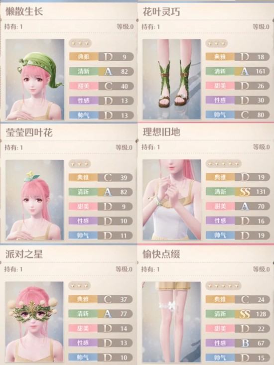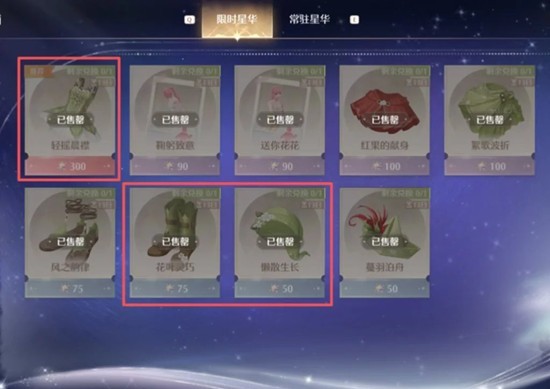1.衣服【轻摇晨襟】、鞋子【花叶灵巧】、帽子【懒散生长】:三件都是星光小铺兑换