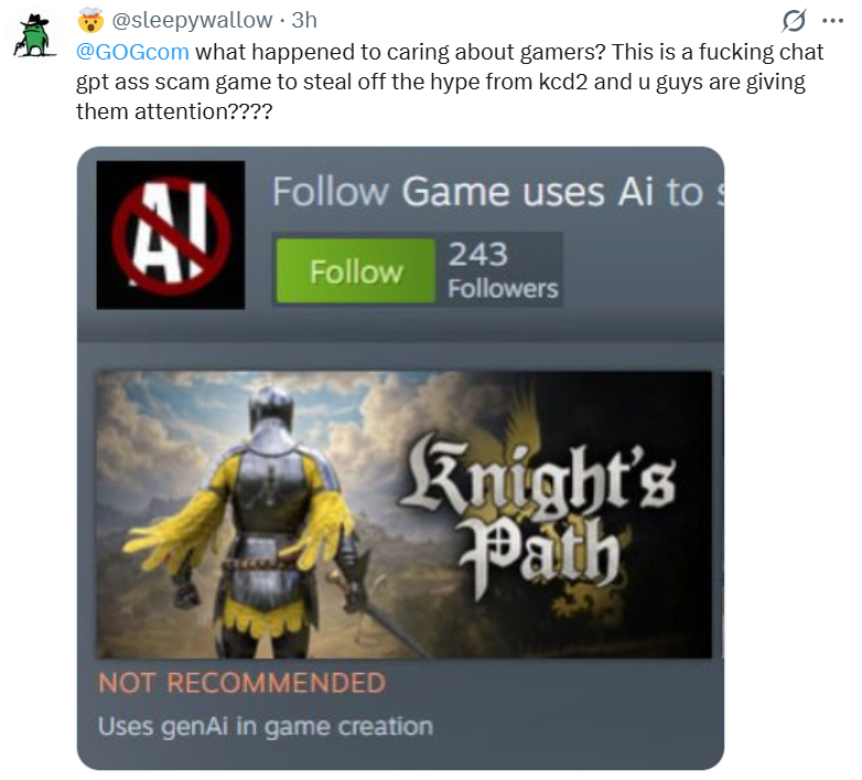 最近一款叫《骑士之路》的独立游戏在国外火了,起因是这款游戏的开发组硬刚DEI,随后遭到某组织惯用的“取消文化”(抵制),不成后又被诬陷是AI生成。但这样做的结果反而是让《骑士之路》更火了,一个简单的官方实机宣传片就在油管上超过了34万观看。