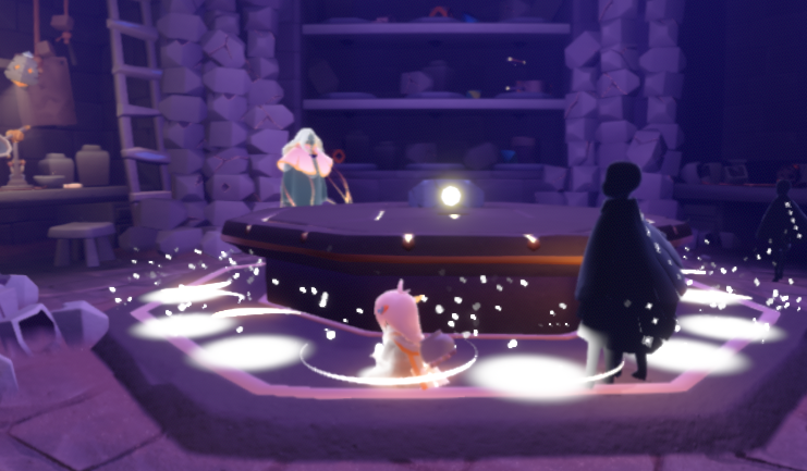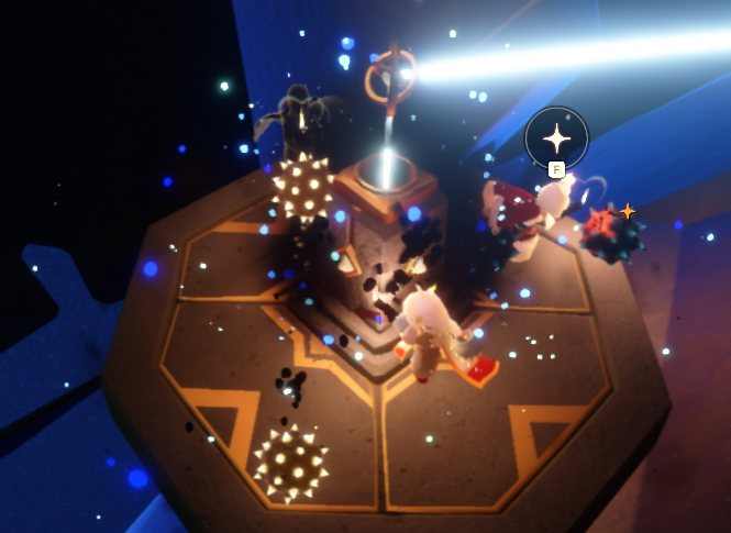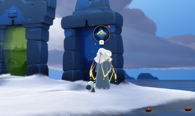 3、到达平台,找到先祖开始任务,需要找到灯笼,灯笼在上方里面的一个小浮台上,如果能量不够,可以在斜坡上找到一小簇蜡烛,点燃回能,平台需要穿过狭小的斜坡往里走。
