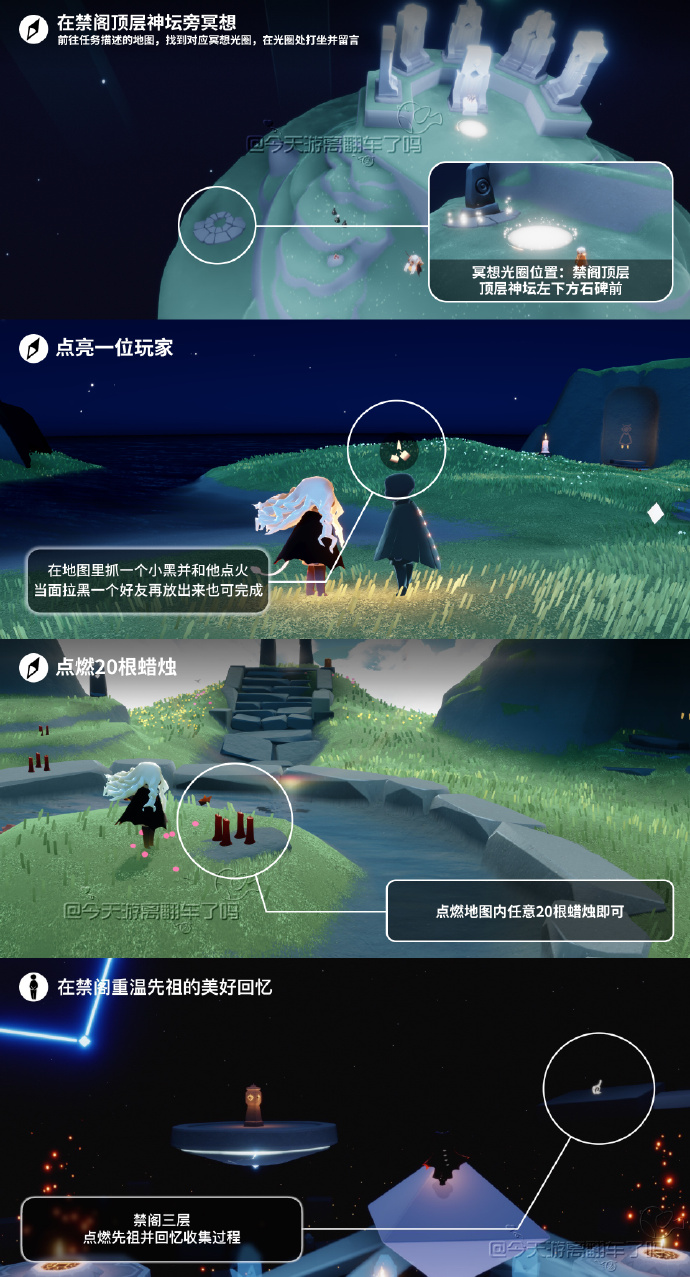 任务①在禁阁顶层神坛旁冥想:禁阁顶层最里面左侧冥想