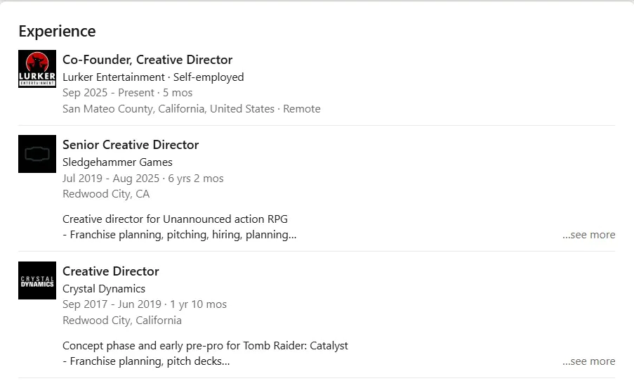 Ben Wanat还负责原型制作、玩家机制和世界布局的设计,以及环境和角色的概念创作。然而,他在2025年8月离开了Sledgehammer Games,因此目前尚不清楚该游戏是否仍在开发中。
