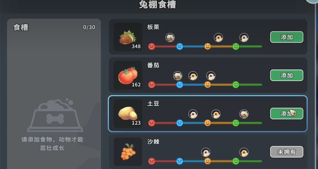除兔子外,游戏内其他可饲养动物亦有专属食性:鸡类以板栗为最优饲料,牛则依赖土豆维持健康状态。每种动物对饲料类型、投喂频率及圈舍规格均有差异化要求。例如,兔舍需满足最小空间阈值,而牛棚则需更大占地面积。合理匹配饲料供给与设施配置,是保障养殖效益的前提条件。