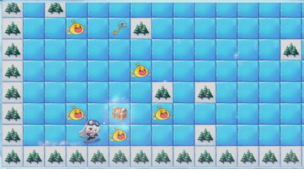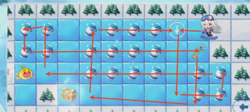 雪场活动不仅提供鲜牛奶与铃铛两类基础道具,还能逐步解锁后续奖励节点,整体节奏友好、投入产出比高。但需特别注意:角色在无遮挡冰面上会持续滑行,直至碰撞障碍物(如树木)才停止。因此每一步移动前都应预判终点位置。初期关卡地形规整,推荐采用“右→下→左→上”顺时针路径,可完整拾取全部奶瓶,并精准停驻终点,新手一次通过率极高。随着关卡递进,地图扩展为标准网格结构,策略调整为“先右后左、由外向内”——优先清理右侧所有奶瓶,再开启宝箱;随后转向左侧区域,切忌直冲终点,避免遗漏关键目标。