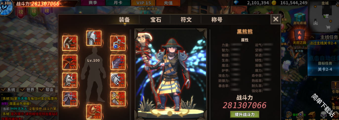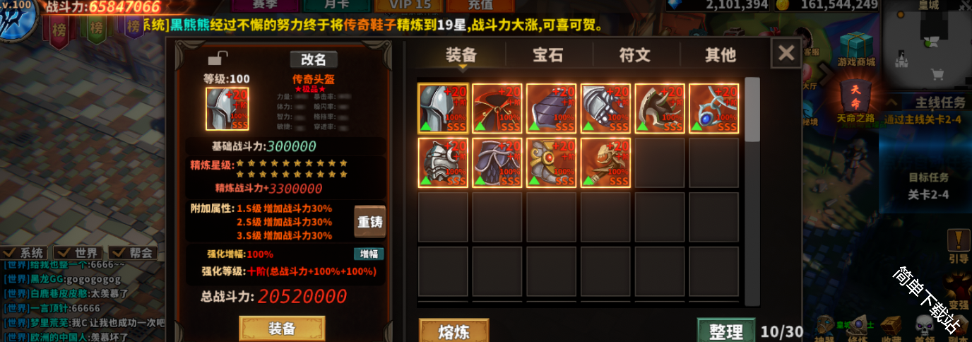 装备把精炼、附加属性、强化增幅 都强上去,这一套战力能上2亿4左右。