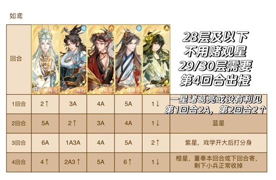 走核爆,练度在29和30层需要赌第4回合出橙星才能打s董奉,其他层数不用管观星颜色伤害也足够了
