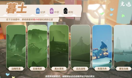 在以上地图地点中,黑色藤蔓以每小时一次的频率随机刷新位置,完成清理后蝴蝶将会自动追随并给予色彩辉光!