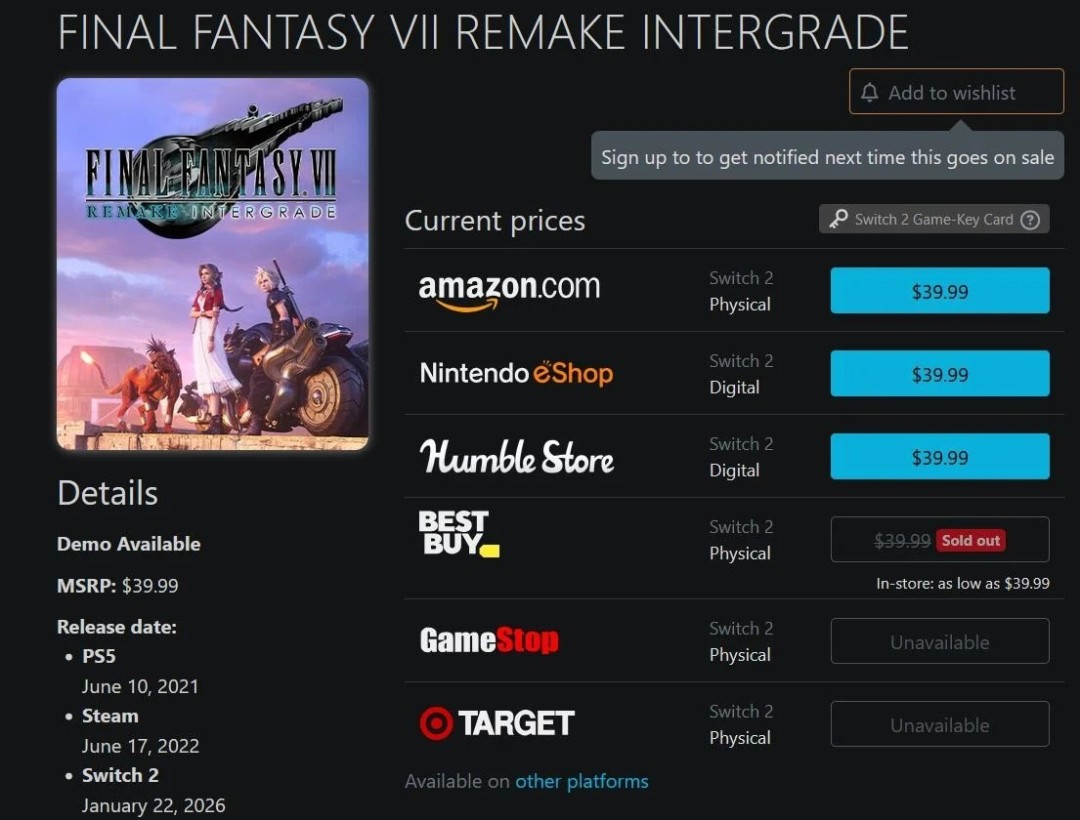 在登陆任天堂Switch 2平台仅三天后,《最终幻想7:重制版Intergrade》的实体版目前在美国除亚马逊外的主要零售商处已全部售罄。