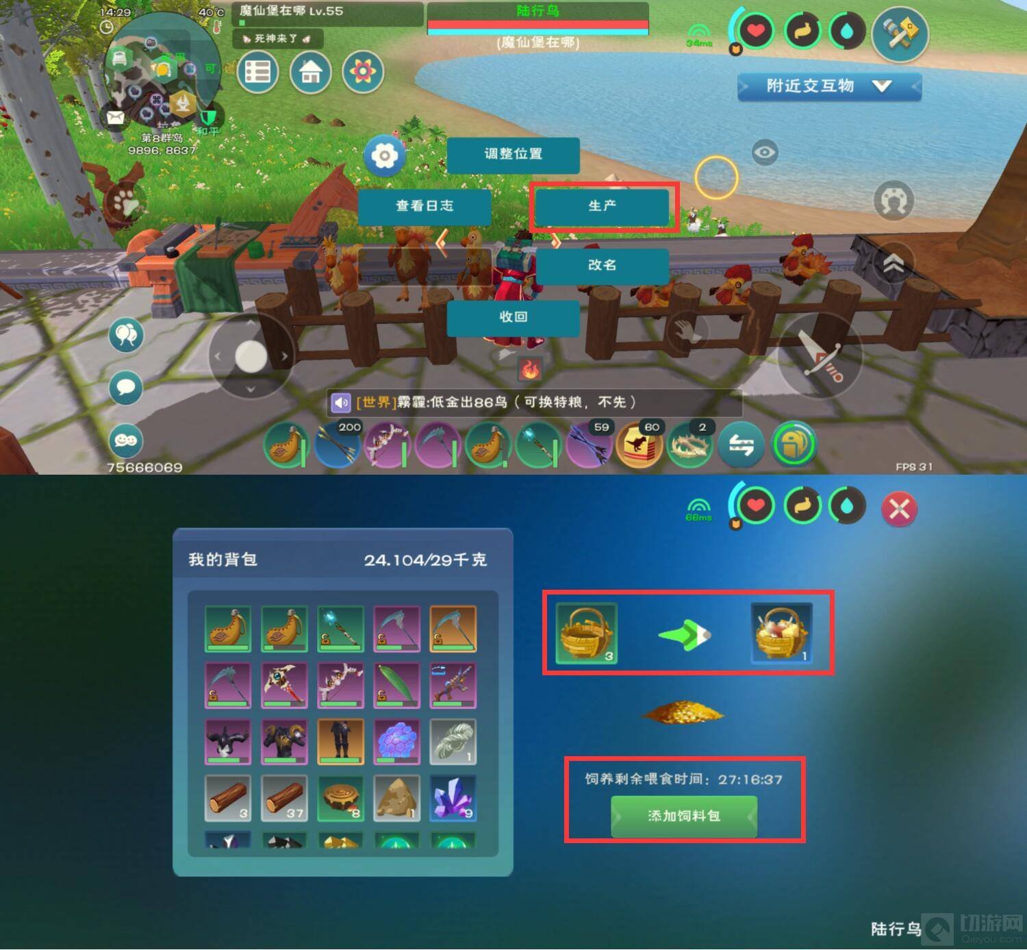 2、比如陆行鸟,抓捕陆行鸟作为家园宠物的话需要将他放置在家园中,接着做一个编织筐,小麦胡萝卜饲料,然后将编织筐投放,燃烧饲料包,过12个小时就可以生产出一筐陆行鸟羽毛,鸡生产鸡蛋,奶牛生产牛奶,羊生产羊毛也是同样的操作步骤。