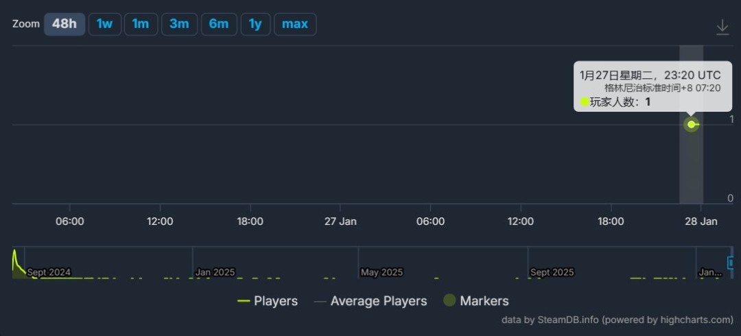根据第三方平台SteamDB的数据显示,自游戏9月6日关服以来仍有13名玩家打开了这款游戏,直到9月17日便只剩下了一名玩家,而这名玩家从那开始便时不时打开游戏看上两眼,长则两三天,短则几十分钟,有时这个人数甚至会翻倍来到两人。