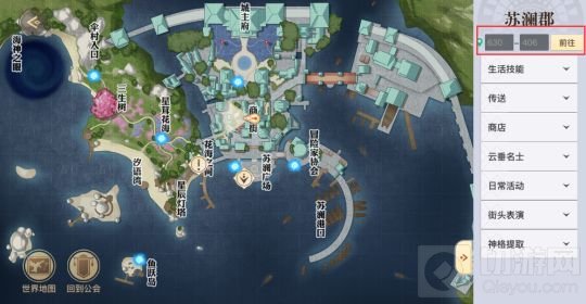 玩家可以来到商业街这里,然后来到这个坐标为苏澜郡630.406这里,也就是仙菇药剂的下面,然后可以使用探查模式,就可以看到有个蓝色的藏起的宝箱。
