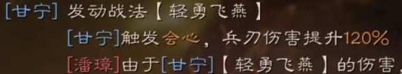 同时会心的效果在甘宁身上也更加强大,这就不得不先提会心的作用方式,甘宁的自带战法将在会心的作用方式后面讨论。以下先提供甘宁目前触发会心效果时的描述: