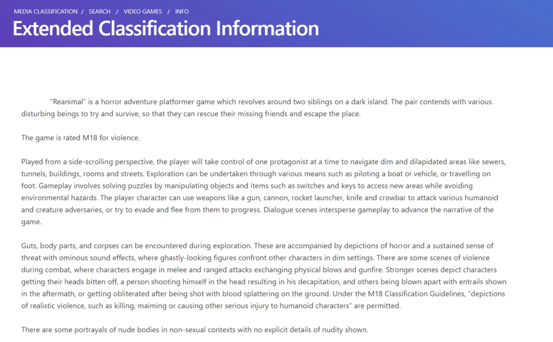 根据IMDA的评级描述,《生灵重塑》被评为M18级主要归因于其高强度的暴力内容。游戏讲述一对兄妹被困于一座黑暗岛屿,为拯救失踪朋友并逃离此地,他们必须在令人不安的怪物威胁下努力生存。