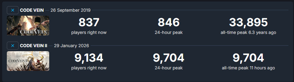 Steam在线峰值也同样不理想。根据SteamDB统计,《噬血代码2》Steam同时在线峰值没有过万,只有9704人,而6年前的《噬血代码1》,Steam在线峰值都有33895人。可以说,《噬血代码2》在线连前作的三分之一都不到。
