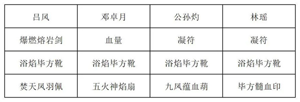 第六回合:吃燃血丹,公孙灼打出百战心法,邓卓月打出御火咒、衍火诀、五火神焰和焚生灭世诀,吕风复制焚生灭世诀,林瑶打出燎原诀和战意诀,吕风打出2张焚生灭世诀。