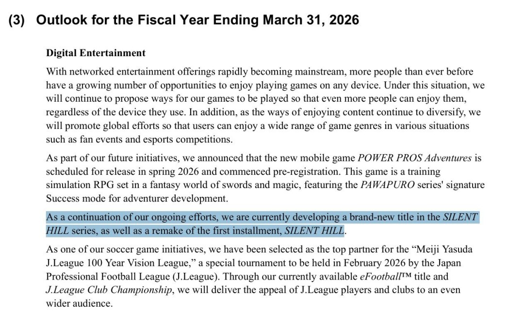 财报并未透露关于这个神秘项目的任何细节。此外,科乐美重申《寂静岭》初代重制版正在积极开发中。开发者Bloober Team曾在2025年底确认游戏已进入全面制作阶段,一些内部人士称其开发已历时3年。