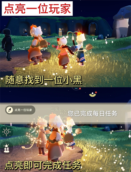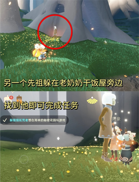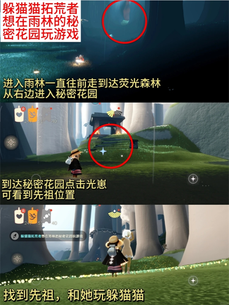 4.躲猫猫拓荒者在秘密花园需要帮助:进入雨林荧光森林后从右前方入口进入秘密花园,根据蓝色标志指引找到先祖领取任务,找到躲藏起来的先祖即可