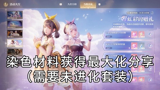 《无限暖暖》2.2 版本「虹彩的赠礼」是限时虹染任务活动,核心是完成虹染操作、材料消耗与分享任务拿钻石 / 养成材料,那么这一任务怎么用最少的材料拿到最多的奖励呢?为你准备了一份攻略,一起来看看吧~