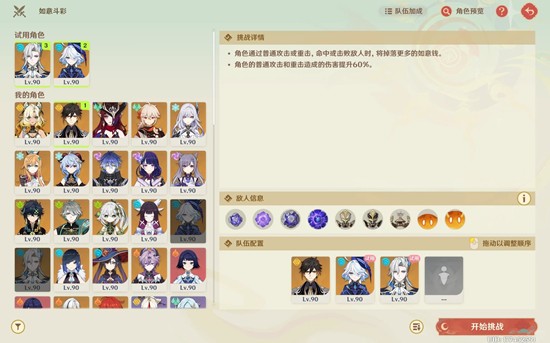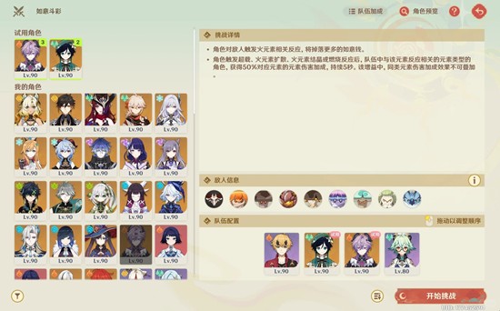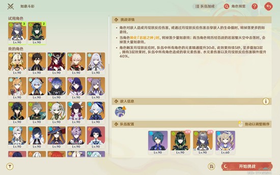 配队:两个试用角色+盾位【钟离(优)/托马(优)/绮良良(优)/蓝砚(优)】+风元素角色【砂糖/万叶/琴/早柚/等】