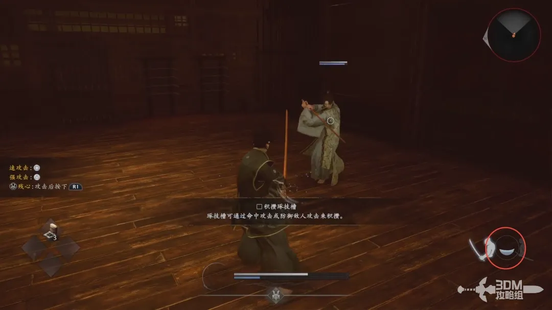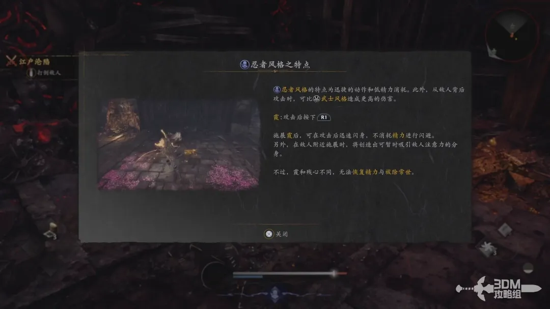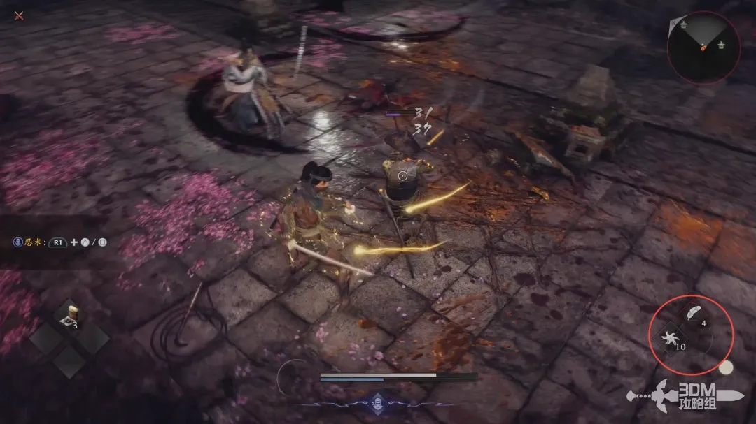 忍者的玩法和武士玩法截然不同,武士玩法主要是掌握好攻击节奏,合理利用精力和逐技槽造成高额伤害;而忍者,则是高机动性的连续攻击然后拉开身位,或是闪身绕后背刺敌人造成高额伤害;