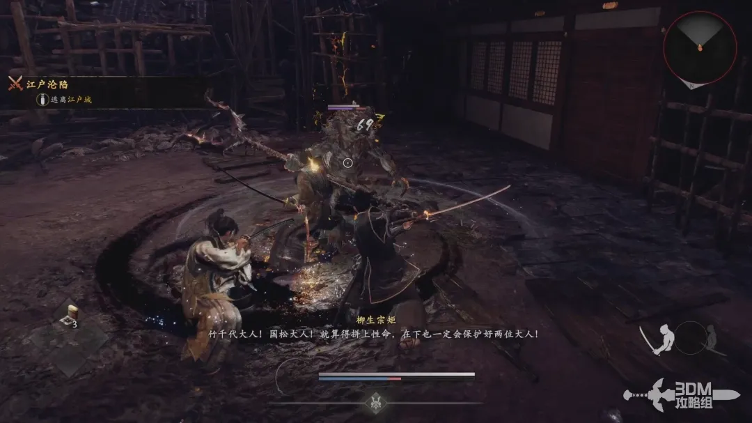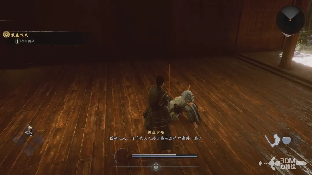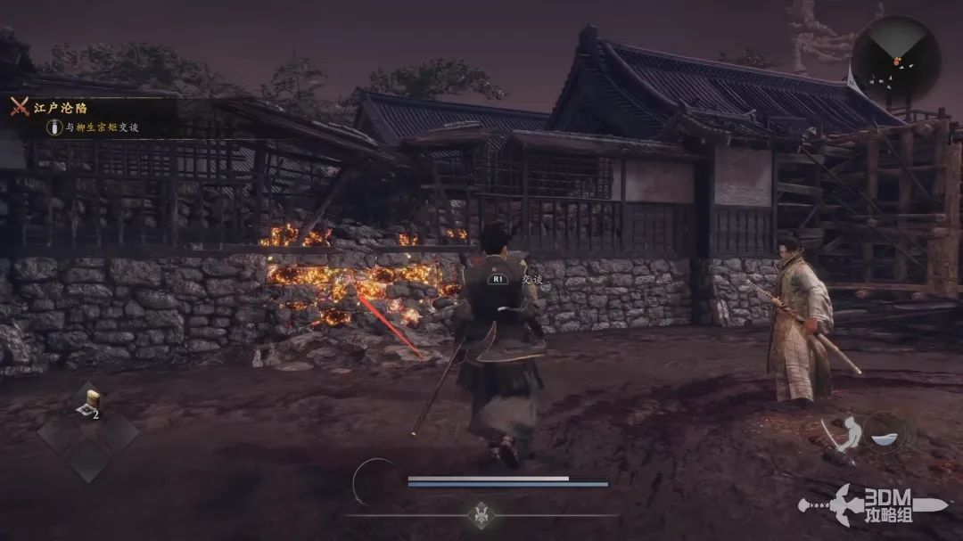 清理完几波敌人后,和柳生宗矩对话,待他劈开后面的围墙后继续前进!