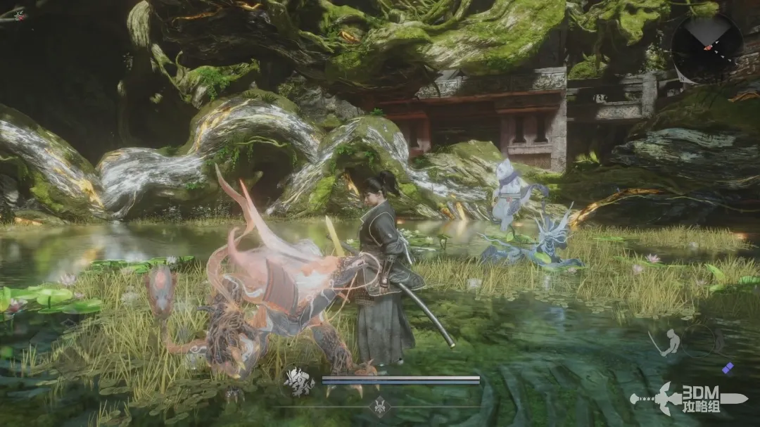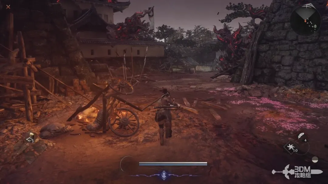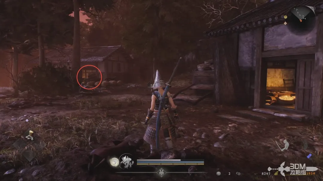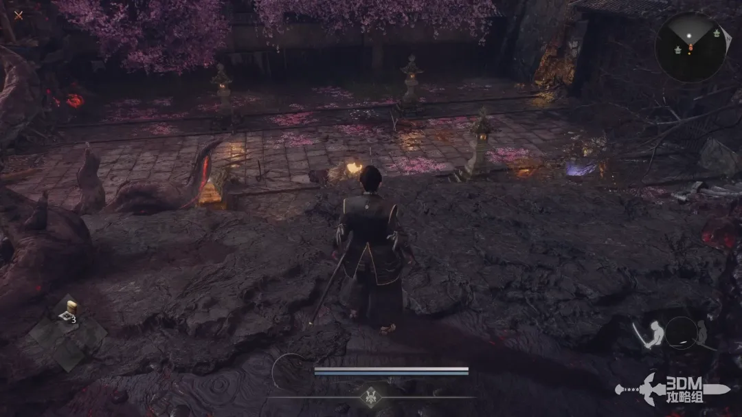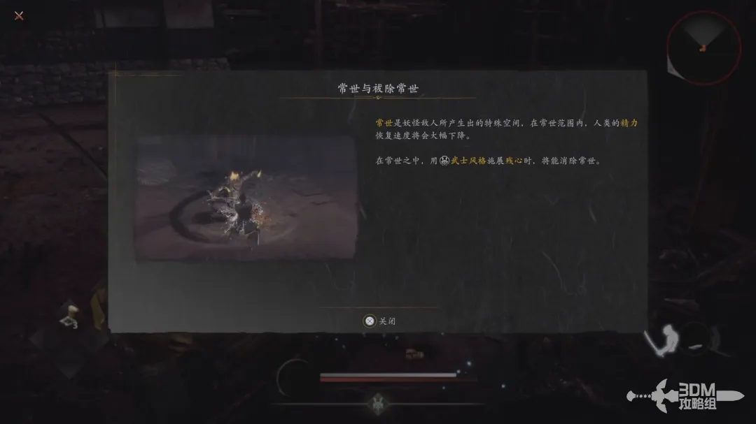 穿过小院子出门,遇到第一个敌人;敌人的脚下会产生水墨一样的区域,在该区域内精力恢复速度会大幅下降,在圆圈内按右肩键恢复体力时会清除常世效果。