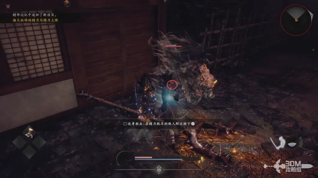 当敌人力竭倒地后靠近(指针变成红色后)按下重攻击(▲)刺杀敌人造成大量伤害。