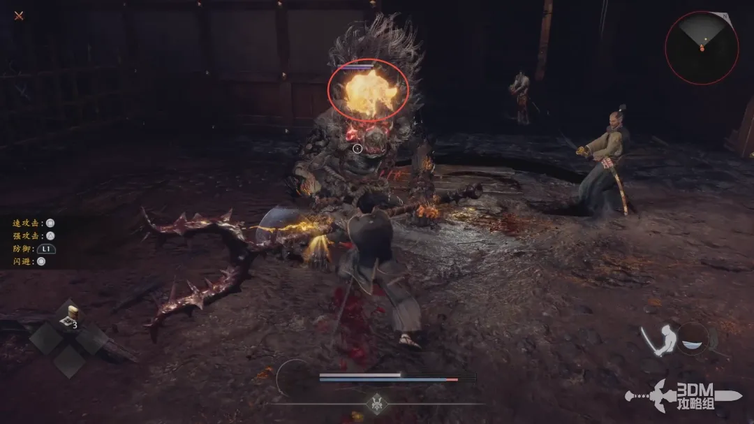 L1(左肩键)防御,圆圈闪避,防御也会损失精力条