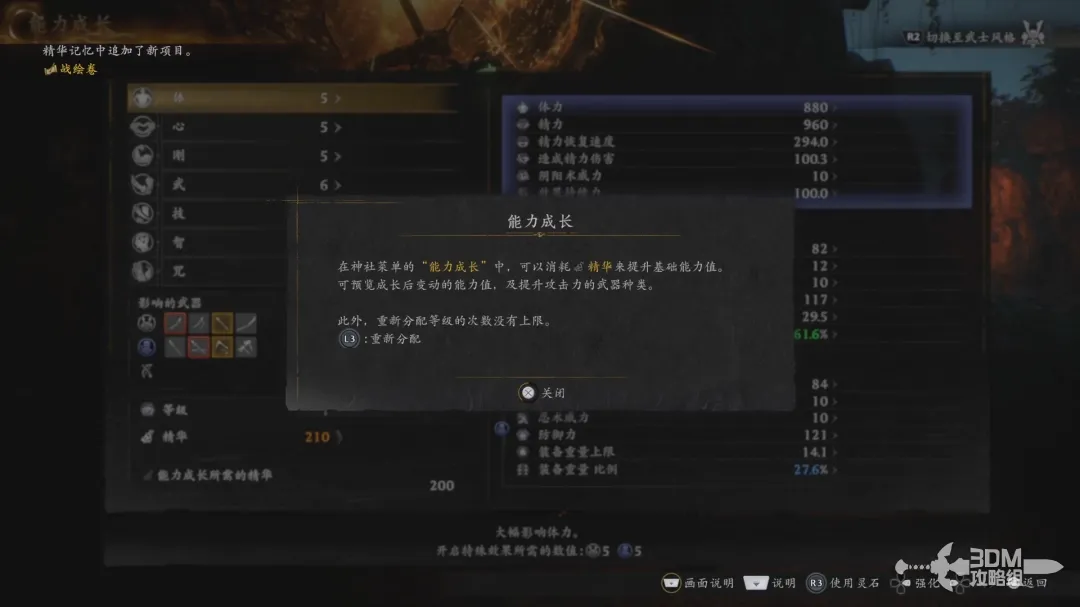 然后就是加点方面,能力成长界面内可消耗精华来升级角色的能力,按住L3可以重新分配之前的等级,而且没有次数上限,因为后面有些强力武器需要对应的能力达到一定的点数后才能穿戴使用。