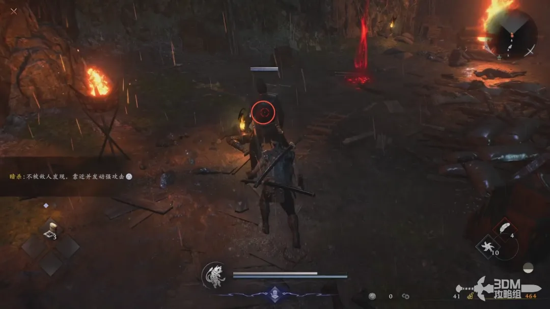 转角营地里有几波敌人,按下L3可以蹲伏,悄悄靠近后(准星变红)按下▲可与暗杀敌人,造成高额伤害,有的血条较厚的怪,可能无法瞬间一击必杀。