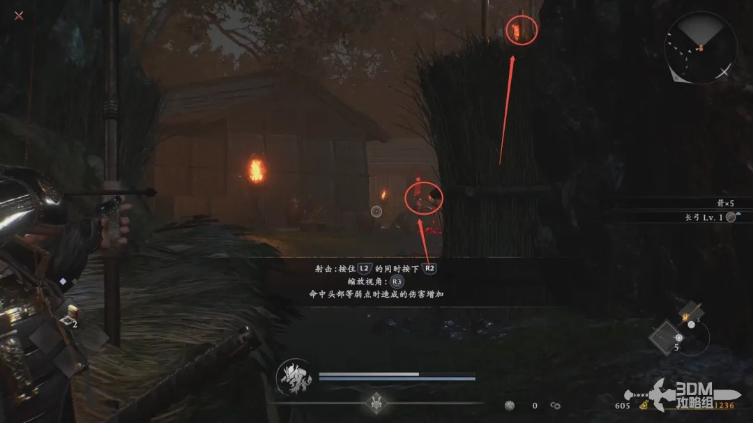 在旁边可以捡几发箭矢,按L2瞄准,R2射击,瞄准的时候按下右摇杆放大准星,命中头部弱点造成高额伤害。