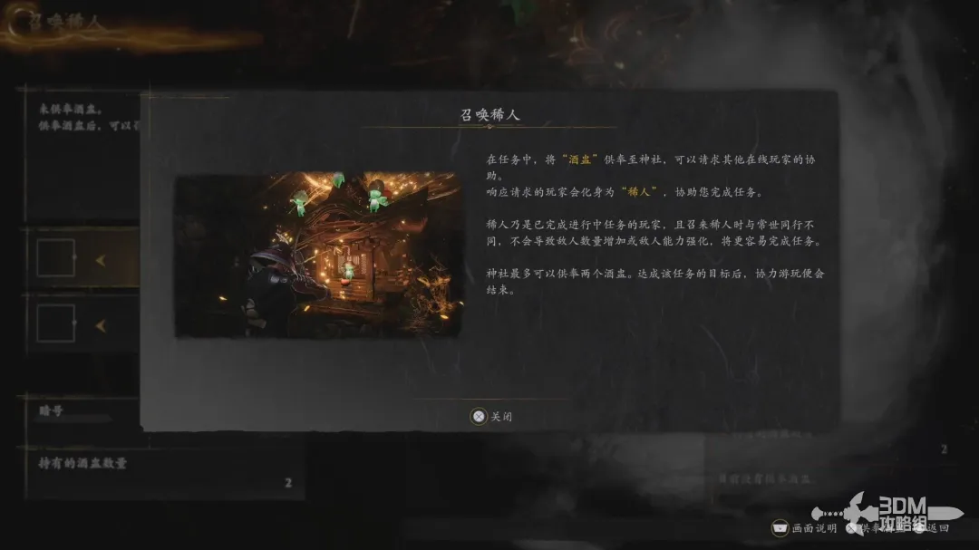 走出营地就有另一个“神社”;在任务中“神社”处可以供奉酒盅召唤稀人来帮助完成任务,召唤稀人并不会增加敌人的数量血量之类的强度。