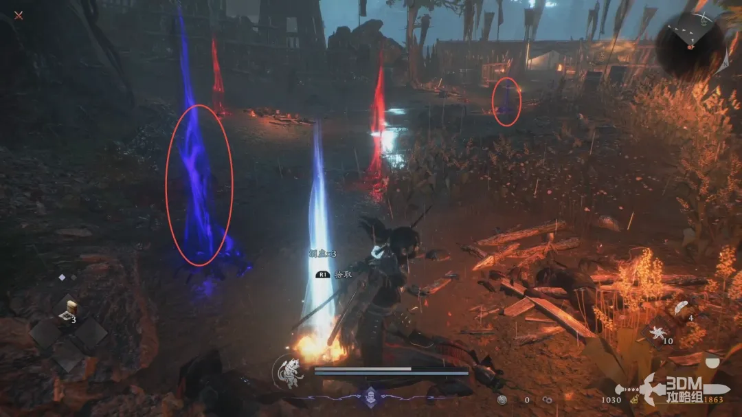 继续前行,在坡下会出现一些蓝色的刀冢“义刀冢”,消耗酒盅可召唤“助人”