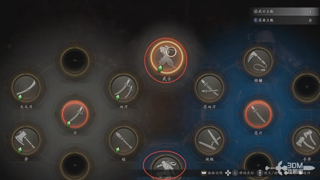 但有些武器需要特殊的架势才能加点,所以优先加点中间的武士和下方的忍者点数。