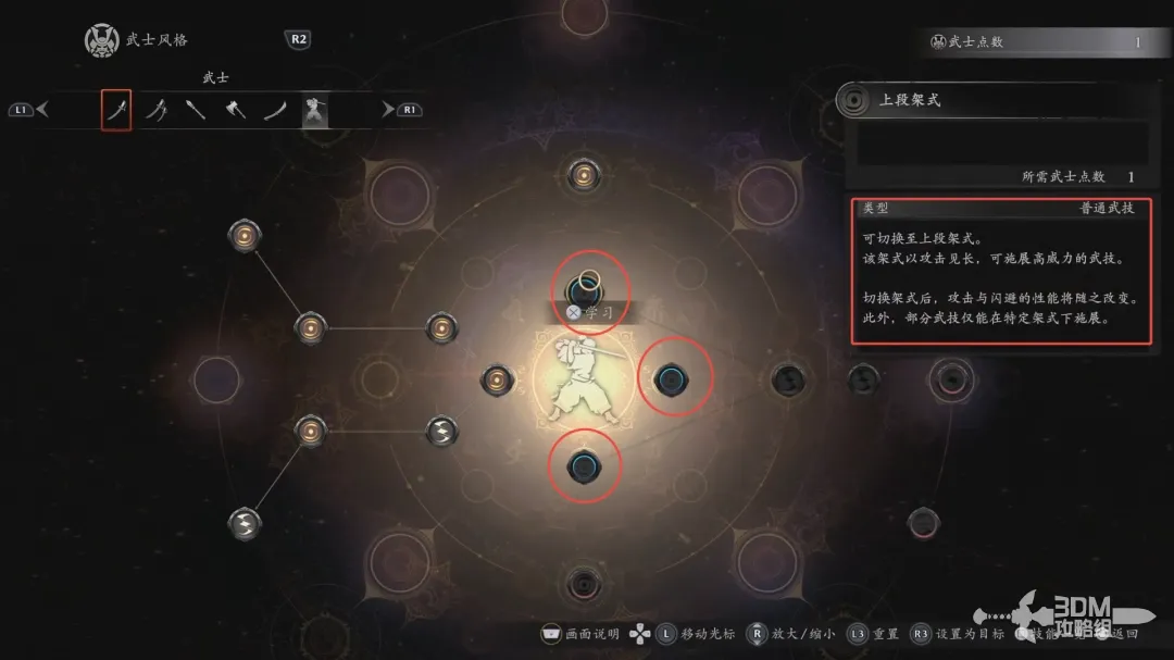 武士风格里不同的架势有不同的效果,例如上段架势擅长进攻,下段架势擅长闪避,根据自己的习惯和武器的需求加点即可,即使加点错误也可以按左摇杆来重新加点。