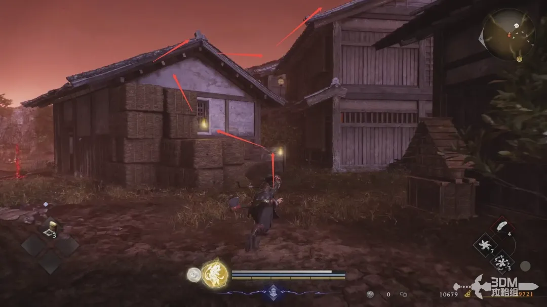 从神社回头,往左走,穿过废墟,跳上高台,前面又会有几只妖怪,跳下去一一解决。