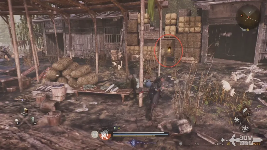 此处房檐上的木灵需要从草垛跳到房顶上,然后绕房顶跑一圈才能拿到.