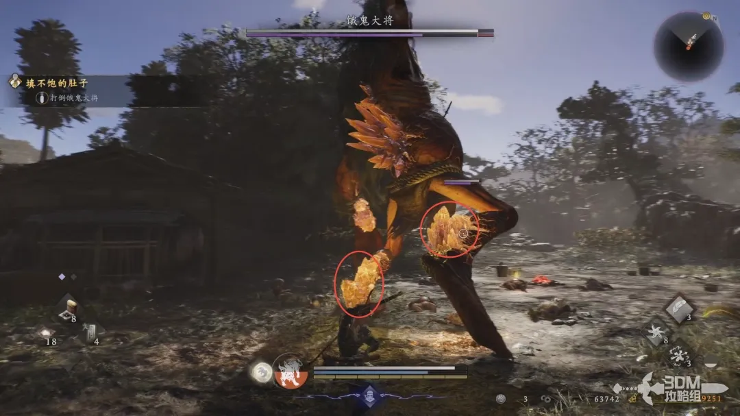 击败饿鬼大将,优先攻击双脚后面的晶装体,饿鬼大酱会倒地。