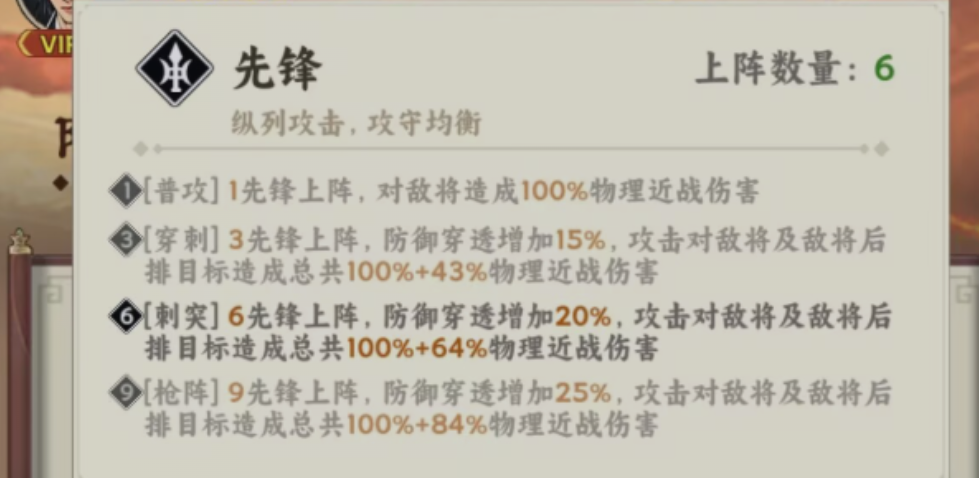 先锋流派的核心优势体现在两个维度:一是“穿刺”羁绊带来的防御穿透加成,二是纵列攻击模式形成的后排压制能力。当阵容中上阵3名先锋武将时,即可激活基础穿刺效果,大幅提升对高护甲敌人的伤害转化率;若达成6先锋满编,则穿透属性进一步强化,同时纵列攻击的溅射范围与伤害倍率同步提升,使后排单位承受更高比例的物理输出。