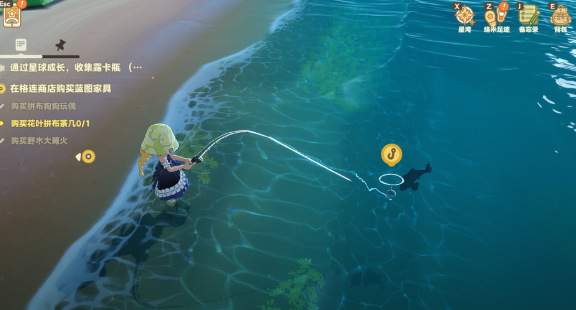 如图所示,水域中常可见一只青灰色外壳的龙虾缓慢爬行,体型较为明显。然而一旦角色靠近,它会立即潜入水底并留下一圈涟漪,说明其具备高度警觉性。直接追击或快速移动几乎无法奏效,关键在于理解其行为逻辑:龙虾每隔数秒会短暂回头观察周围环境,此时任何位移都可能触发逃跑反应。