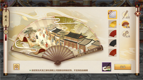 激活百变如意扇外观后,活动期间可通过神器幻化、活动大厅或直接使用丹青引,三种方式轻松开启制扇界面,可自由选择扇骨、扇面和纹饰,纹饰还能自由调整,打造专属扇面。